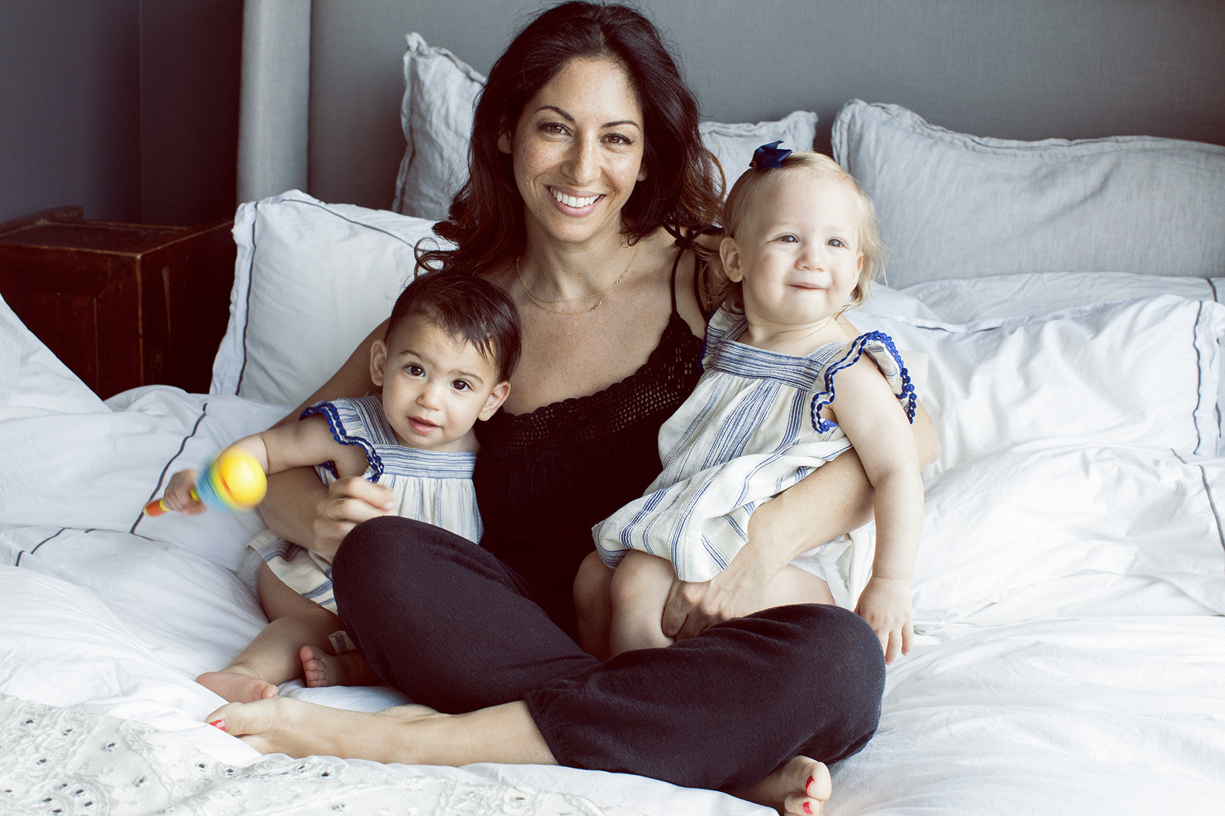 Its funny because I had such a different idea of the kind of parent I thought I was going to be. I had always imagined that I'd approach it in a bohemian way. I had visions of throwing my baby in a sling and taking them everywhere. All that changed when two babies showed up at the same time. I am still very relaxed with them, but we have fully embraced a schedule and rhythm for the babes. And we have found that they thrive and enjoy having one. Having twins dictates a lot about what you can and can not do at the beginning.