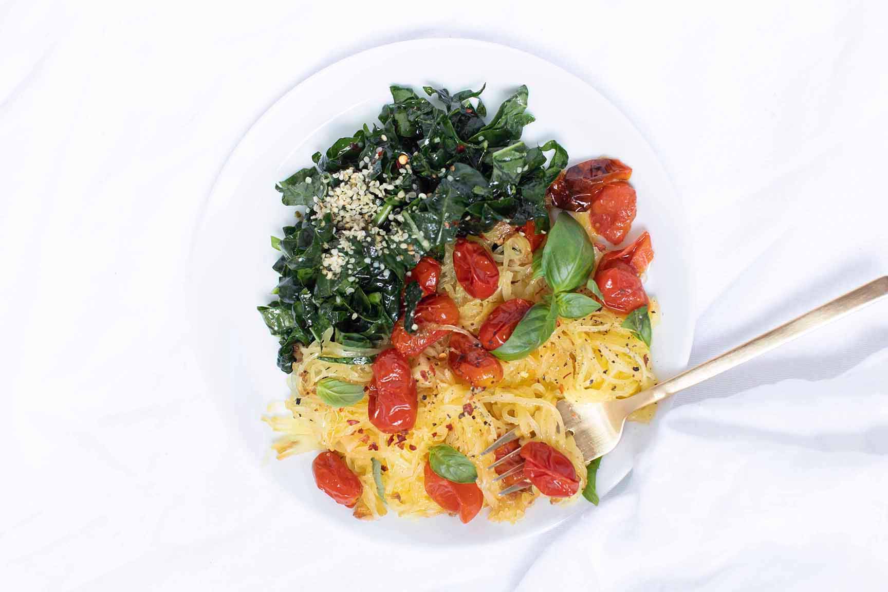 - When spaghetti squash is cool enough to handle, drag a fork across the flesh, creating angel-hair like strings. Place directly on plates, and top with roasted tomatoes, rear fresh basil on top, and season with salt and red pepper flakes. Serve with kale salad, topping with hemp seed. Store extra in the fridge.