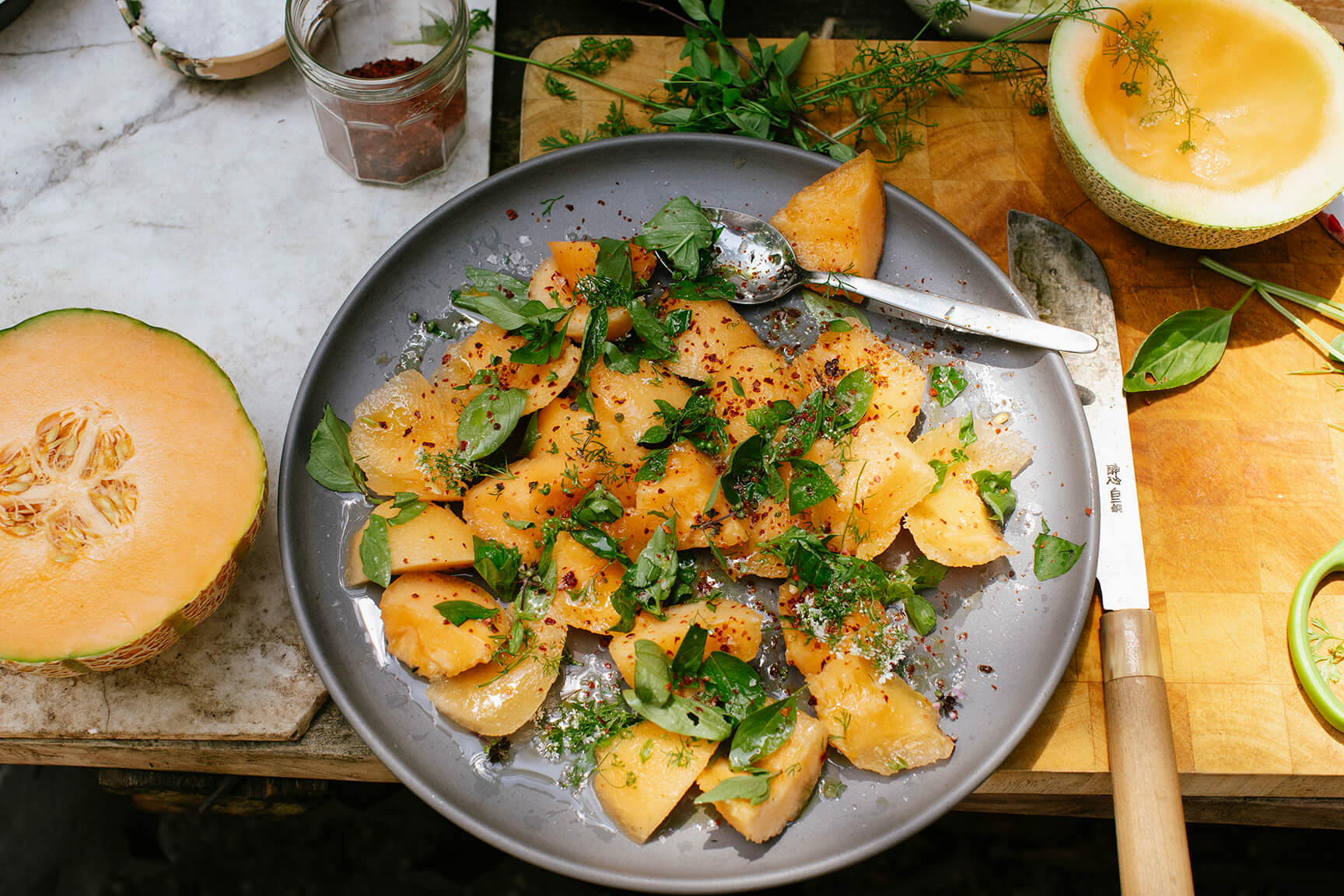 2. Season the melon with lime juice and toss very gently to combine. Add half the basil and fold through, then season with flaky salt, a pinch of cayenne, and a few dashes of MSG. Drizzle with olive oil and top with remaining basil. Let sit for a few minutes for juices to release before serving.